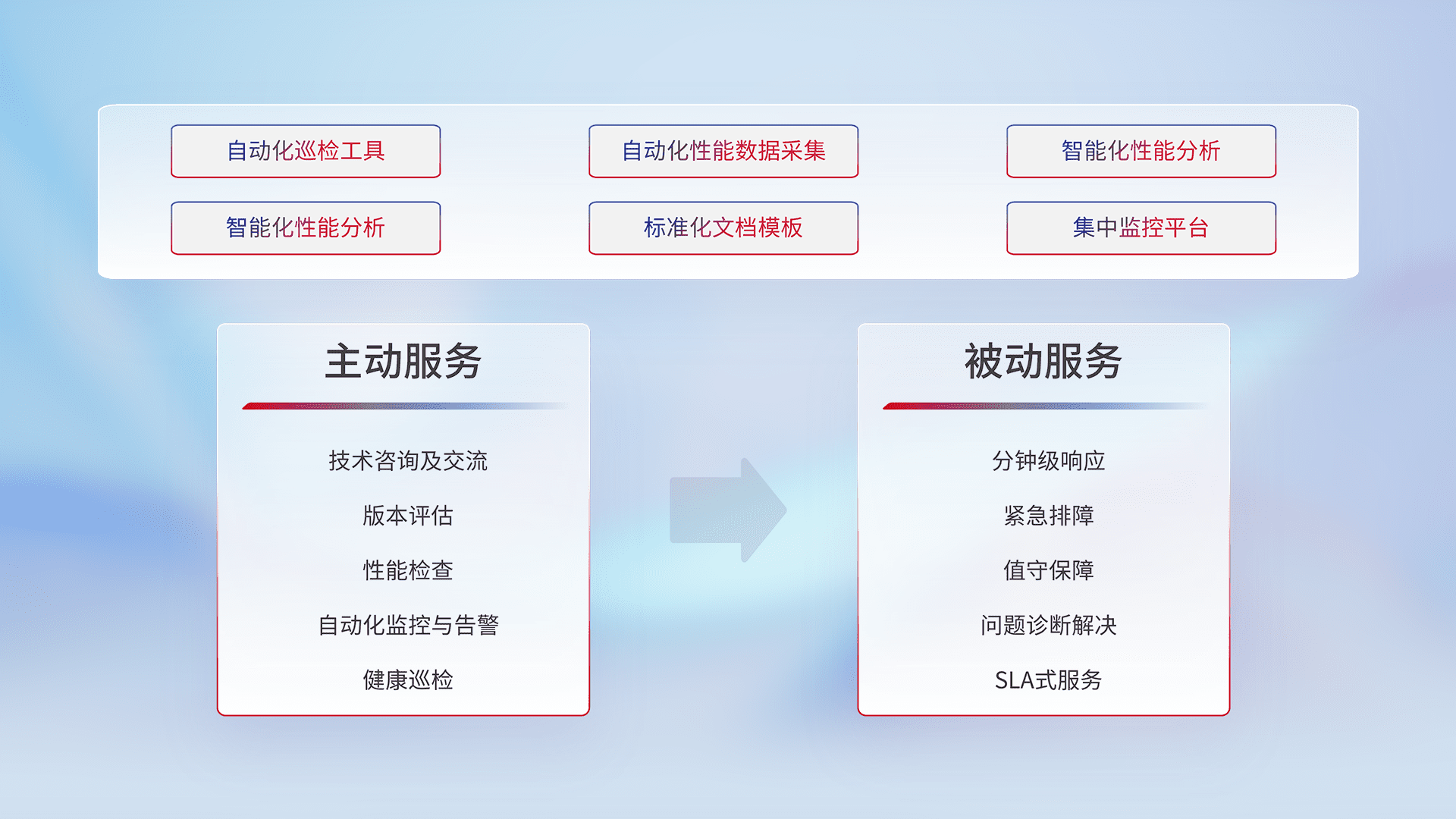 智能化工具和标准化文档,,保障服务质量,,,,提供主动服务(包含技术咨询、、、、版本评估、、性能检查、、、、自动化监控与告警、、健康巡检)和被动服务包含(分钟级响应、、、紧急排障、、、值守保障、、问题诊断解决、、SLA服务)。。。。
