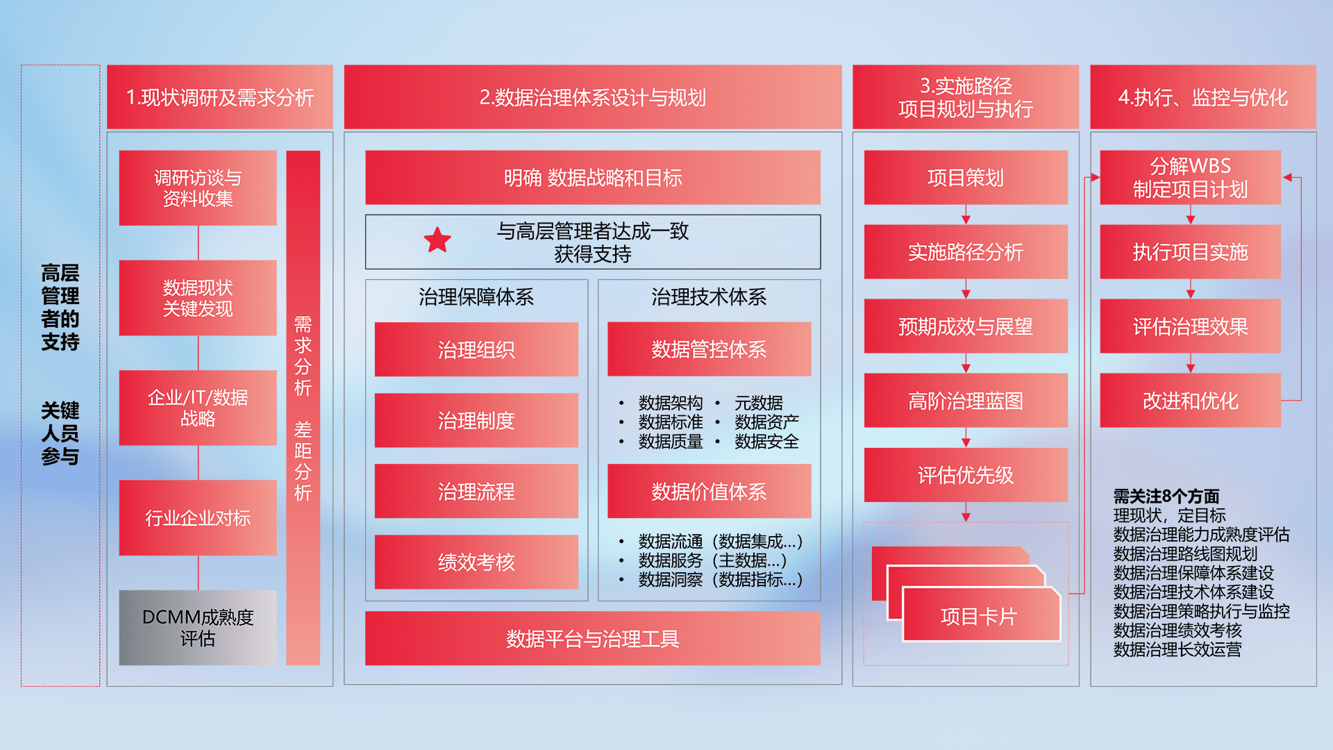 制定并执行统一的数据标准,,,,规范数据定义和格式,,,消除冗余和不一致性,,实现跨部门和跨系统的数据一致性,,,,为企业提供标准化的数据基础。。